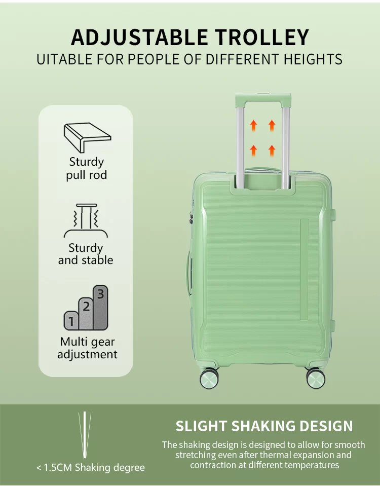 ลงทุนในกระเป๋าเดินทางที่ทำจากวัสดุ PP คุณภาพสูง และสัมผัสกับความสมดุลที่สมบูรณ์แบบระหว่างความทนทาน ความสะดวกสบายน้ำหนักเบา และการออกแบบที่ทันสมัย ​​ซึ่งเป็นทางเลือกที่ช่วยปกป้องทรัพย์สินของคุณและยกระดับประสบการณ์การเดินทางของคุณ