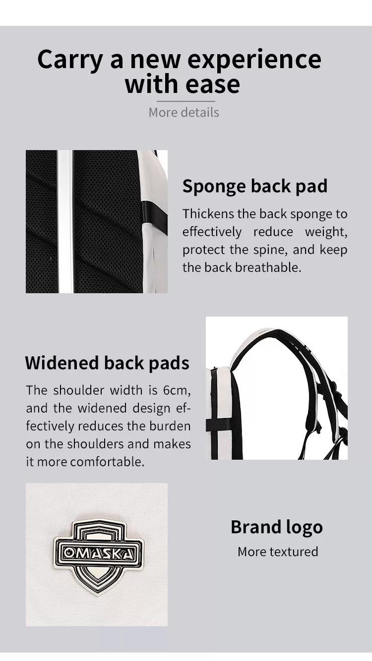 กระเป๋าเป้สะพายหลังแบบพกพาของเราเป็นเพื่อนที่สมบูรณ์แบบสำหรับชีวิตประจำวันและการเดินทาง น้ำหนักเบา ทนทาน และใช้งานได้หลากหลาย มีช่องหลายช่องสำหรับจัดเก็บหนังสือ แกดเจ็ต และของใช้ส่วนตัวอย่างเป็นระเบียบ สายสะพายไหล่บุนวมและแผงด้านหลังที่ระบายอากาศได้ช่วยให้มั่นใจถึงความสบายระหว่างการสวมใส่เป็นเวลานาน การออกแบบที่กะทัดรัดและพกพาได้ทำให้เหมาะสำหรับการเดินทาง การออกนอกบ้านแบบสบายๆ หรือการเดินทางช่วงสุดสัปดาห์ การเย็บเสริมและซิปคุณภาพรับประกันความทนทานยาวนาน กระเป๋าเป้แบบพกพานี้ผสมผสานการใช้งานจริง สไตล์ และความสะดวกสบาย เหมาะสำหรับนักเรียน มืออาชีพ และนักเดินทางที่กำลังมองหากระเป๋าที่เชื่อถือได้ สะดวกสบาย และมีสไตล์ทุกวัน