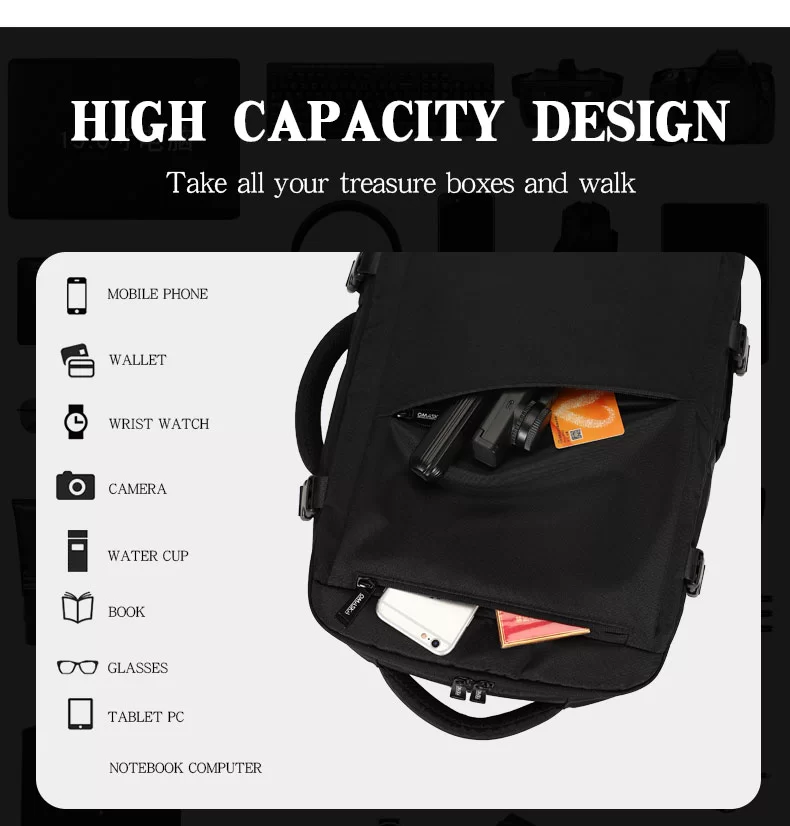 ภายในกระเป๋าเป้สะพายหลังมีช่องแล็ปท็อปบุนวมโดยเฉพาะซึ่งสามารถรองรับอุปกรณ์ต่างๆ ได้ถึง 17 นิ้ว ช่วยให้อุปกรณ์อิเล็กทรอนิกส์ของคุณปลอดภัยในระหว่างการเดินทาง กระเป๋าที่มีการจัดระเบียบหลายช่องช่วยให้เข้าถึงเอกสาร ที่ชาร์จ เครื่องเขียน และของใช้ส่วนตัวได้ง่าย มั่นใจได้ว่าทุกอย่างจะเข้าที่ ช่องหลักกว้างขวางพอที่จะใส่ไฟล์ โน้ตบุ๊ก และแม้แต่เสื้อผ้าสำหรับเปลี่ยน ทำให้ใช้งานได้อเนกประสงค์ในวันทำงาน การเดินทางเพื่อธุรกิจ หรือกิจกรรมนอกเวลาทำการ